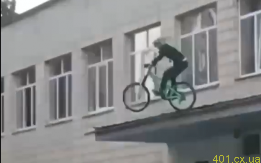 На кадрах видно, как подросток стоит на козырьке здания с велосипедом в руках. После чего он разгоняется и пытается перепрыгнуть лестницу. Приземлиться на оба колеса ему не удалось, поэтому подросток потерял равновесие, упал и довольно сильно ушибся рукой.